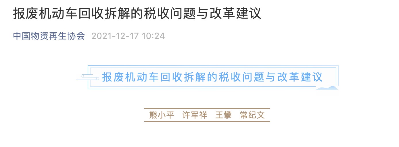 為解決報(bào)廢機(jī)動(dòng)車(chē)拆解行業(yè)稅收問(wèn)題,玉成有限公司董事長(zhǎng)王攀先生攜手行業(yè)大咖,共同提出《報(bào)廢機(jī)動(dòng)車(chē)回收拆解的稅收問(wèn)題與改革建議》。