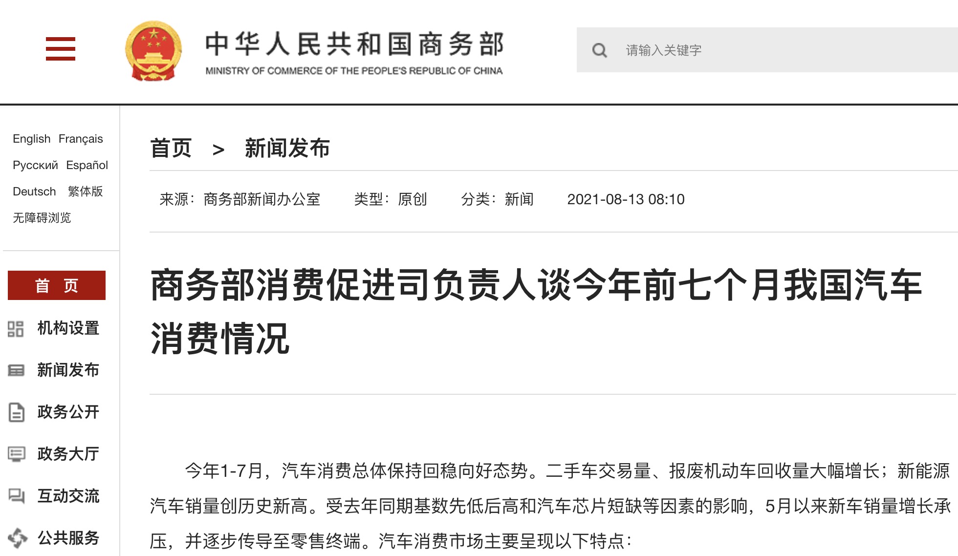 今年1-7月,汽車消費(fèi)總體保持回穩(wěn)向好態(tài)勢。二手車交易量、報廢機(jī)動車回收量大幅增長;新能源汽車銷量創(chuàng)歷史新高。受去年同期基數(shù)先低后高和汽車芯片短缺等因素的影響,...