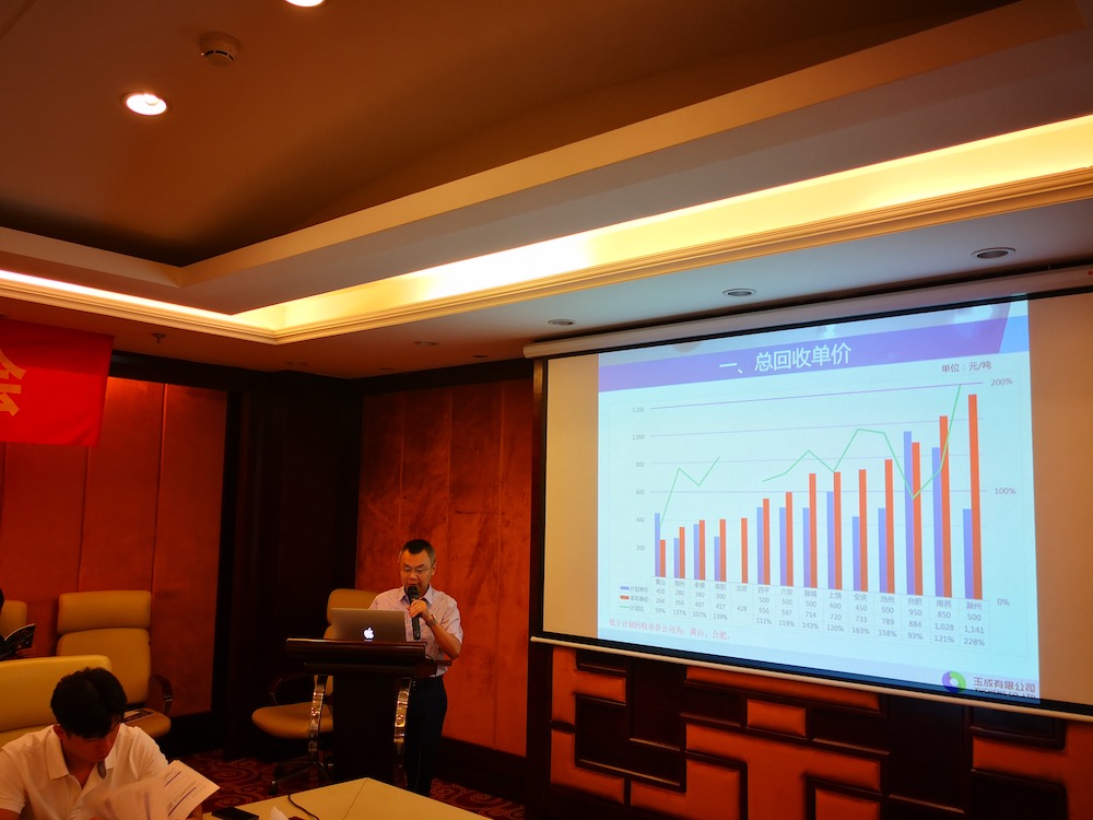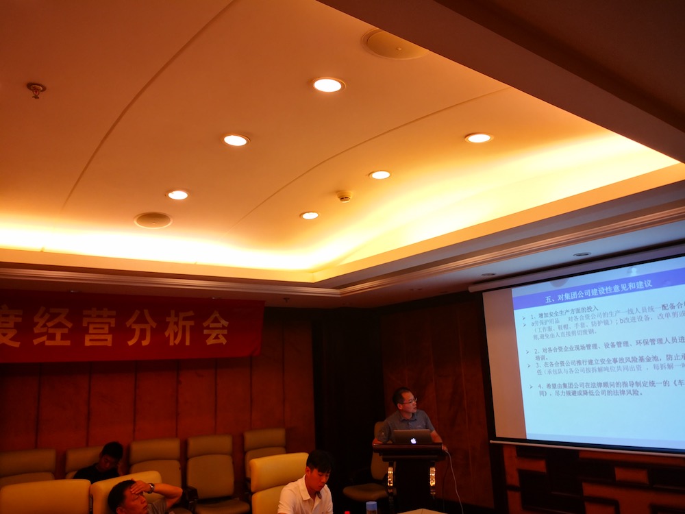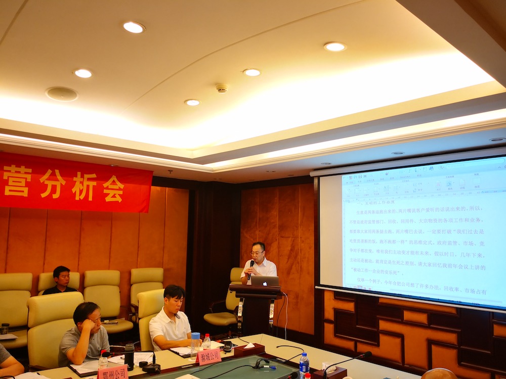 7月21-22日,玉成有限公司2018年上半年度經(jīng)營分析會在合肥外經(jīng)戴維斯酒店召開,報廢車業(yè)務(wù)板塊合資公司董事長、總經(jīng)理,集團(tuán)本部骨干員工共計近40人參加了會議,會議分別由副總裁何學(xué)海和戴子海主持。