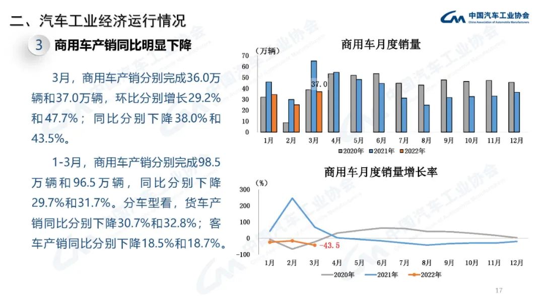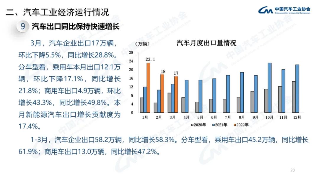2022年3月,國內(nèi)疫情近期多發(fā),市場主體困難明顯增加,經(jīng)濟循環(huán)暢通遇到一些制約,新的下行壓力進一步加大。從汽車供給端看,芯片短缺的情況沒有得到明顯緩解,動力電池原材料價格快速上漲,進一步推高企業(yè)產(chǎn)品制造成本,汽車企業(yè)生產(chǎn)經(jīng)營活動受到一定影響,總體形勢不及預(yù)期;從汽車消費端看,消費動能明顯不足,與同期相比,呈現(xiàn)一定幅度下降。