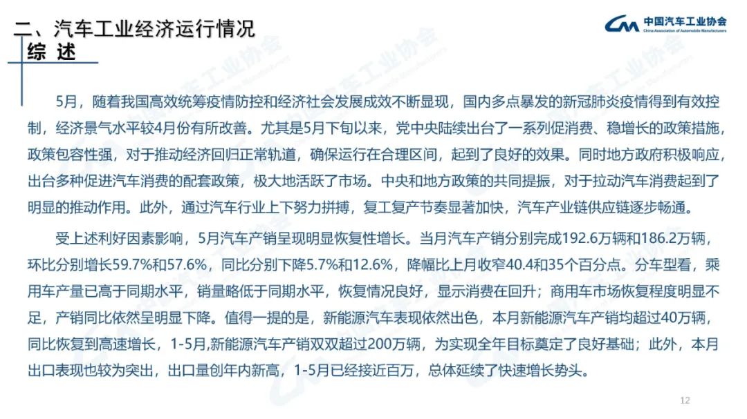受利好因素影響,5月汽車產(chǎn)銷呈現(xiàn)明顯恢復(fù)性增長(zhǎng)。乘用車產(chǎn)量已高于同期水平,銷量略低于同期水平,恢復(fù)情況良好;商用車市場(chǎng)恢復(fù)程度明顯不足,產(chǎn)銷同比依然呈明顯下降。新能源汽車表現(xiàn)依然出色。本月出口表現(xiàn)也較為突出,出口量創(chuàng)年內(nèi)新高。