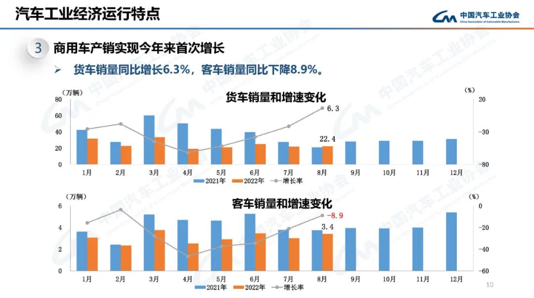 2022年8月,汽車產(chǎn)銷同比延續(xù)保持快速增長勢頭,購置稅優(yōu)惠等促消費政策持續(xù)發(fā)力,乘用車消費企穩(wěn)上升,即使經(jīng)濟(jì)運行有波動,消費依然堅韌,已逐步恢復(fù)到正常狀態(tài);商用車產(chǎn)銷實現(xiàn)今年以來首次同比增長;本月新能源汽車產(chǎn)銷、汽車出口同比均創(chuàng)歷史新高。